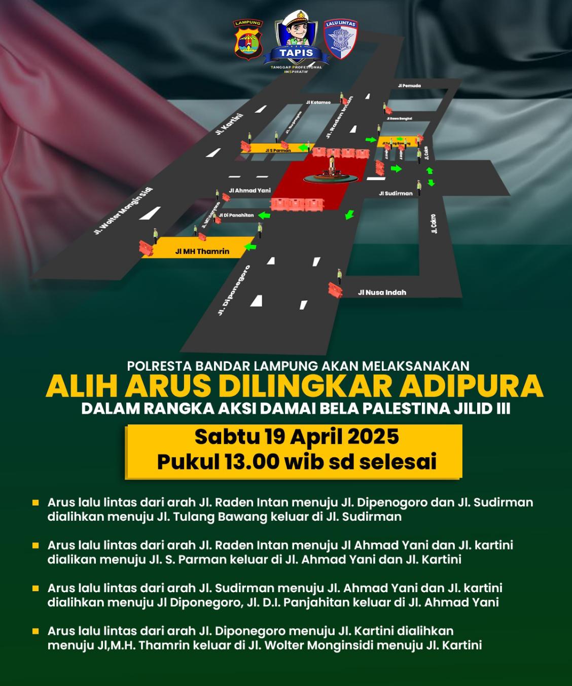 TRANSSEWU.COM -Bandar Lampung – Satlantas Polresta Bandar Lampung akan melakukan sejumlah skenario pengalihan arus lalu lintas jelang aksi damai bela Palestina jilid 3.