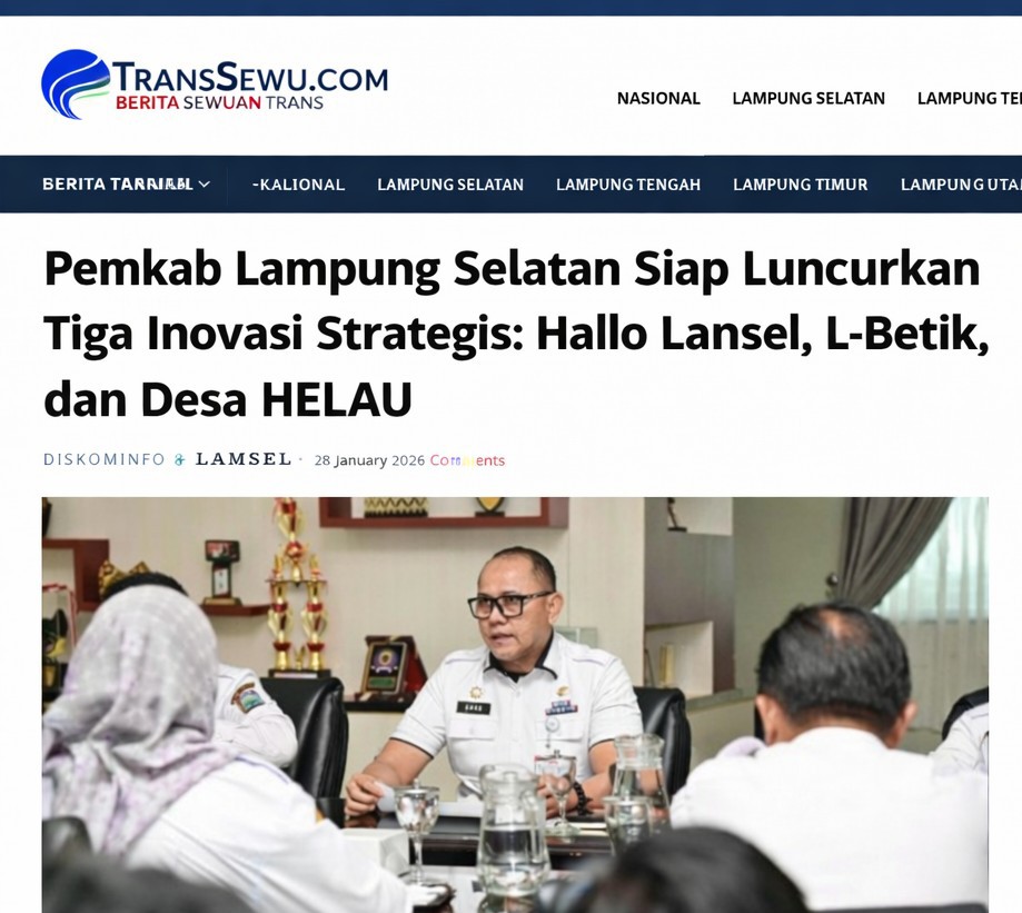 TRANSSEWU.COM – KALIANDA, Pemerintah Kabupaten (Pemkab) Lampung Selatan bersiap meluncurkan tiga inovasi strategis, yakni Hallo Lamsel, L-Betik, dan Desa HELAU, sebagai langkah transformasi layanan publik serta penguatan tata kelola pemerintahan yang modern, transparan, dan partisipatif.
