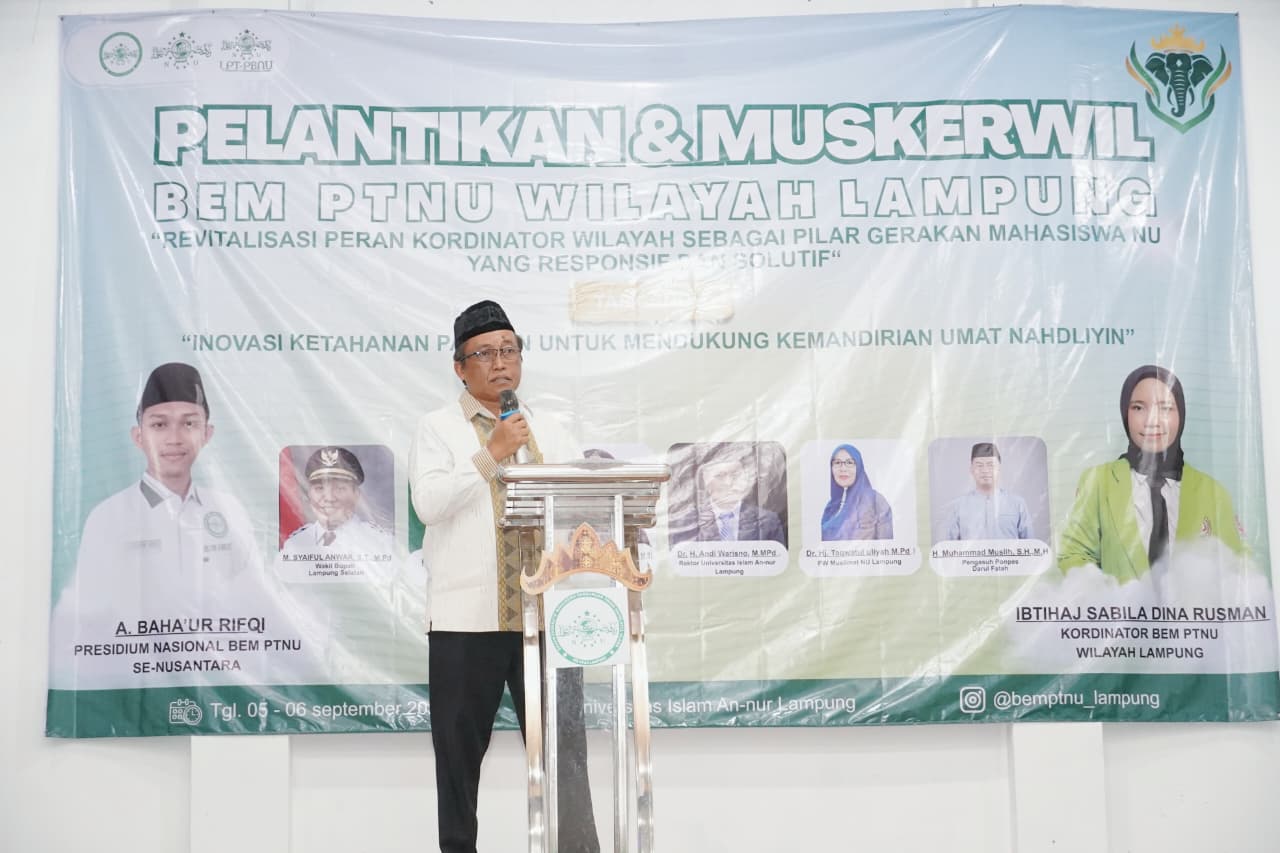 Transsewu.com – Lampung Selatan, Gubernur Lampung yang diwakili oleh Kepala Dinas Komunikasi, Informatika, dan Statistik Provinsi Lampung, Ganjar Jationo, menghadiri Pelantikan dan Musyawarah Kerja Wilayah Badan Eksekutif Mahasiswa (BEM) Perguruan Tinggi Nahdlatul Ulama (PTNU) Wilayah Lampung. Acara ini berlangsung di Gedung Serba Guna Universitas An Nur, Lampung Selatan, Jumat (05/09/2025).