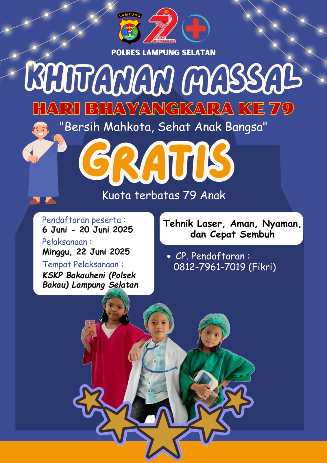Lampung Selatan – Dalam rangka menyambut Hari Bhayangkara ke-79, Polres Lampung Selatan menggelar kegiatan khitanan massal gratis bagi masyarakat. Acara ini akan berlangsung di KSKP Bakauheni (Polsek Bakau), Lampung Selatan, pada Minggu, 22 Juni 2025.