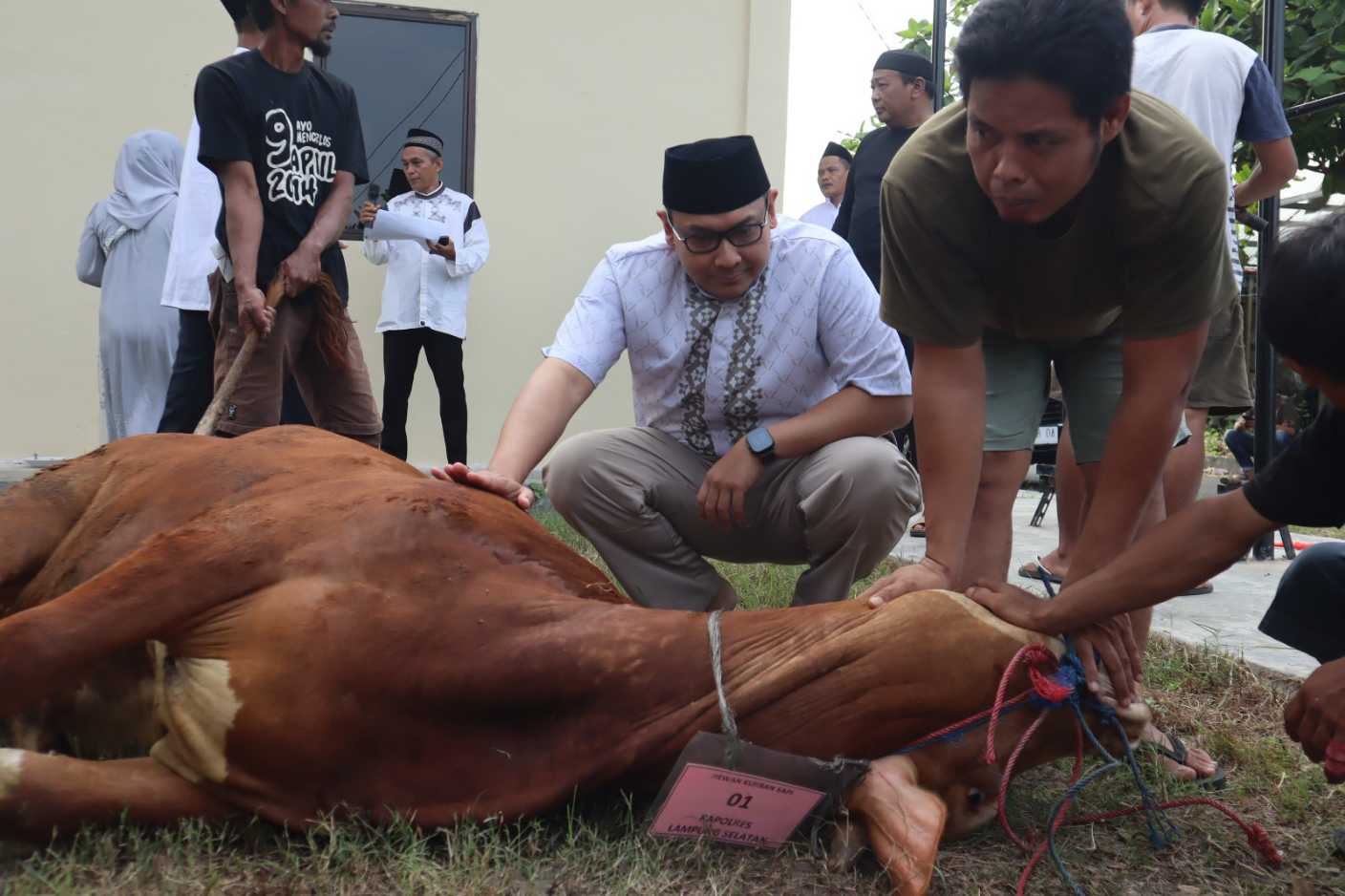 Setelah melaksanakan sholat Idul Adha, kegiatan dilanjutkan dengan pemotongan hewan kurban berupa sapi. Tahun ini, Polres Lampung Selatan menyembelih empat ekor sapi yang kemudian dibagikan kepada berbagai pihak yang berhak menerimanya.